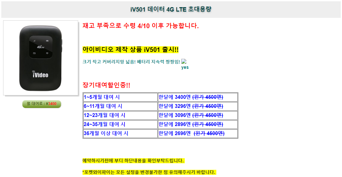 재고 부족으로 수령 4/10 이후 가능합니다. 아이비디오 제작 상품 iV501 출시!! 크기 작고 커버리지망 넓음! 배터리 지속력 짱짱임! 장기대여할인중!! 1~5개월 대여 시 한달에 3400엔 (원가 4500엔) 6~11개월 대여 시 한달에 3296엔 (원가 4500엔) 12~23개월 대여 시 한달에 3096엔 (원가 4500엔) 24~35개월 대여 시 한달에 2896엔 (원가 4500엔) 36개월 이상 대여 시 한달에 2696엔 (원가 4500